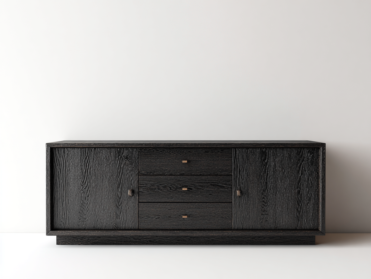 Réalisé en bois avec une finition noire texturée, ce meuble présente un aspect authentique et raffiné. Les poignées discrètes soulignent le caractère minimaliste de l'ensemble, tandis que la base pleine assure une excellente stabilité.